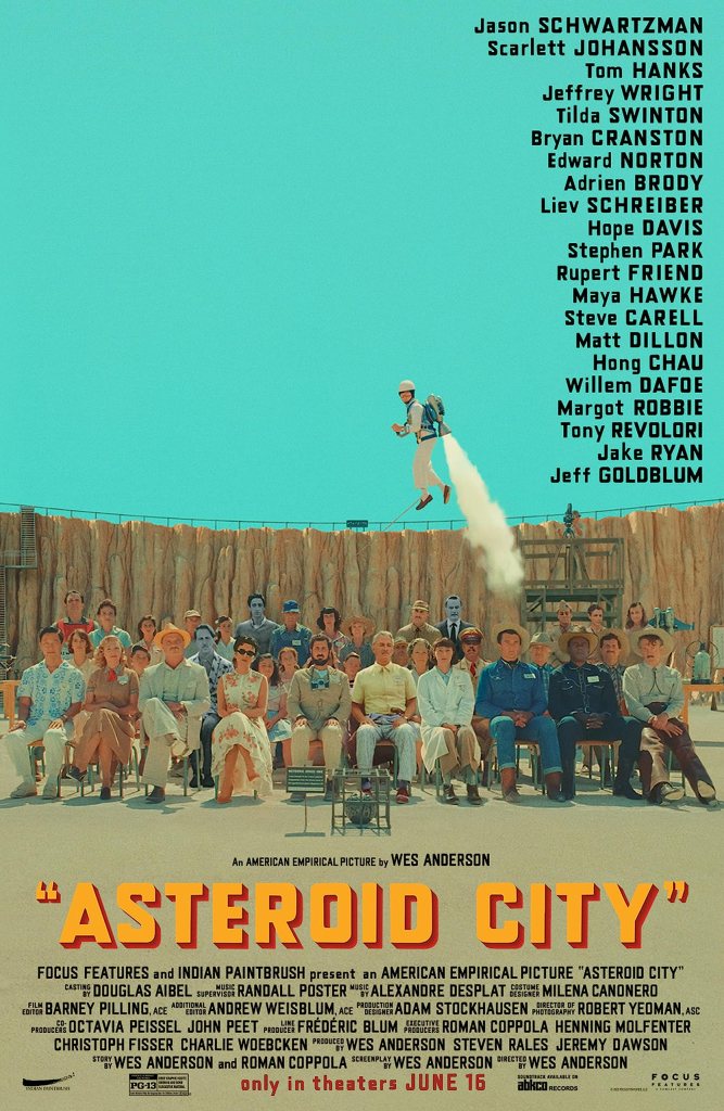Dentro Asteroid City ci sono: il marito, il figlio e il padre di una donna che non c’è ma poi compare, tre streghe bambine, un concorso per piccoli scienziati, un esercito che li ghermisce e mistifica la verità, c’è Beep Beep ma senza Willy Coyote, la bomba atomica, la paranoia, un inseguimento senza senso, un paese di ottantasette anime, una truffa immobiliare, una scolaresca, una maestra che segue il programma, un disco volante, una rivolta, un regista che dorme sul set, un marziano, un’attrice che si trucca ferite interiori sul viso impassibile, un programma televisivo con un presentatore che presenta uno scrittore che non esiste, che scrive un’opera teatrale in tre atti. Che non esiste. E c’è un buco, enorme, in mezzo al deserto.